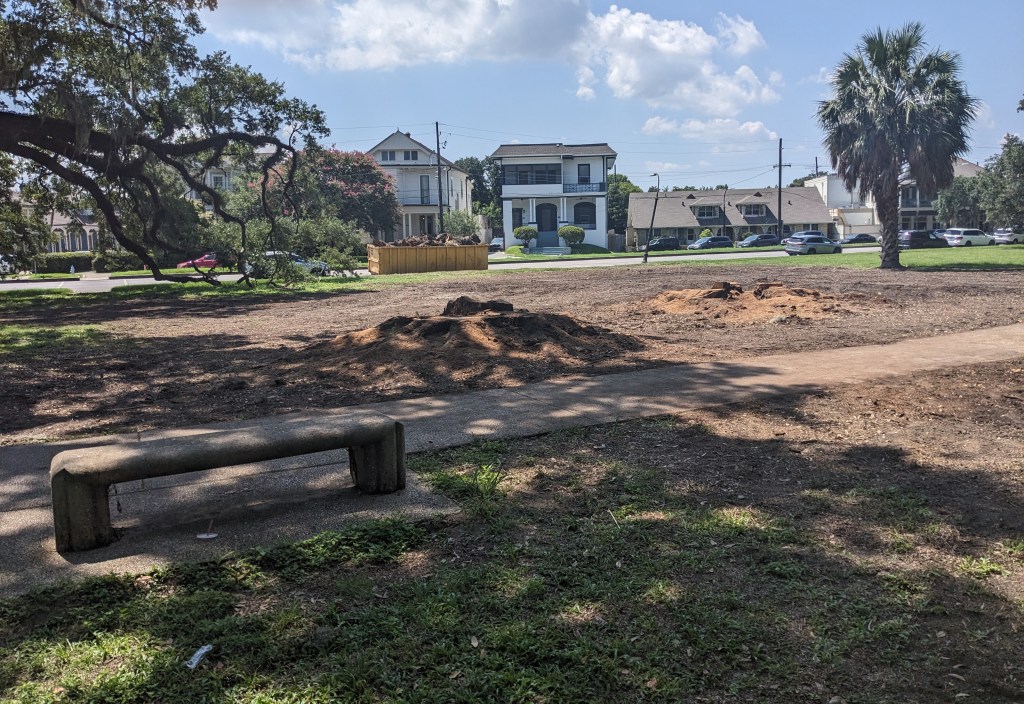 I worried when I heard two live oaks had succumbed to this summer’s heatwave, but none of the online articles told me which trees or where. I went for a walk last Sunday and was looping back along City Park Avenue toward the Chloe fountain and saw the bright sunlight in that formally shaded place, and then the stumps, the dumpster and the sawdust on the rutted, tire-trampled spot where I used to stop.