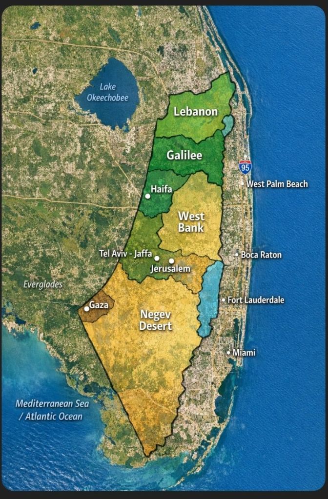 To address the conflict, let’s flip a coin and one group or the other must forfeit their claims and in lieu of what they lost, we will give them southeast Florida. I chose this location for some similarity of climate and no other reason. The loser of the coin toss receives the above territory, shifting the map of historical Palestine East to match the Mediterranean coast.